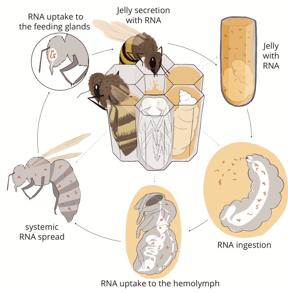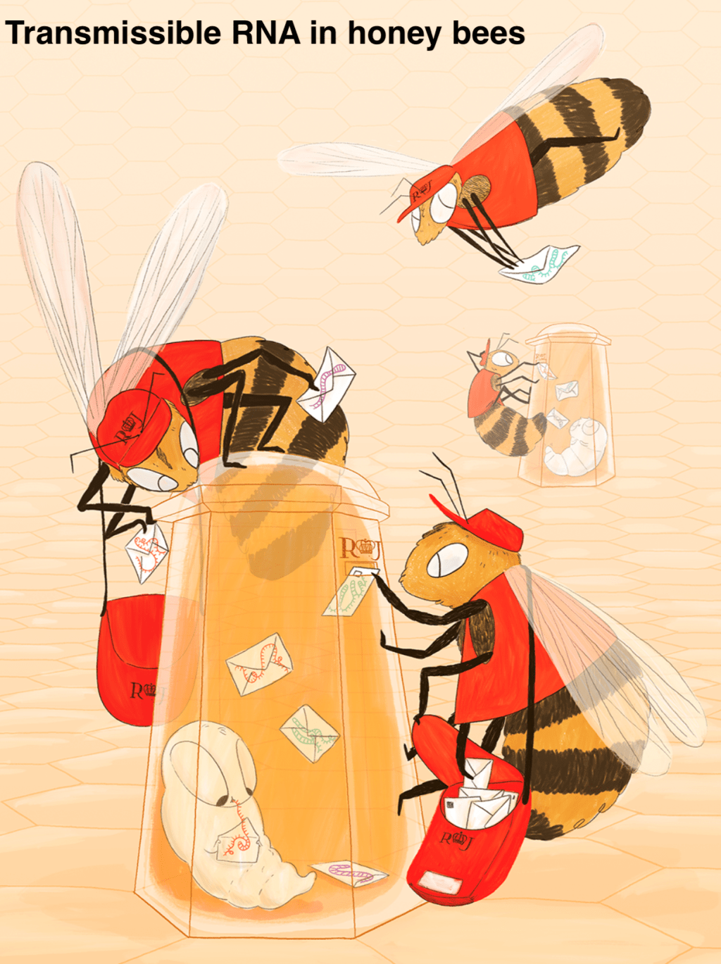 Recently, we unveiled RNA transmission between organisms, which could benefit the recipient individual. We found that honey bees share RNA (including anti-viral RNA) between individuals and across generations in the hive. RNA transmission among honey bees is mediated by ingestion of worker and royal jellies, provided by nurse bees to nourish the young developing larvae. We showed that transmitted RNA is biologically active and can turn off genes in recipient bees. We next asked how does the jelly support RNA transmission between honey bees? We discovered that bees secrete into